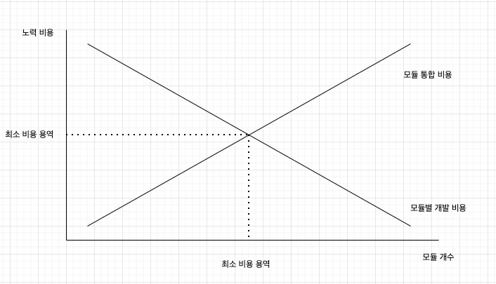 - 모듈의 크기가 너무 크면 모듈 간의 통합 비용이 줄어드는 대신 모듈 당 개발 비용이 커진다.