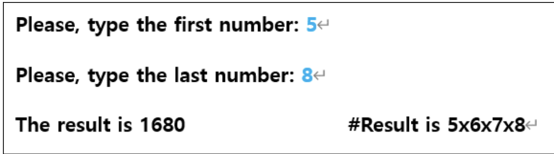 위의 예시 화면과 같이 첫 번째 숫자와 두 번째 숫자를 입력받고 그 숫자들의 범위까지 곱을 진행하면 된다.