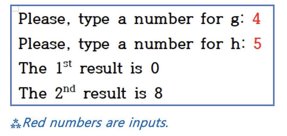 - The submitted program will be tested by changing the values of g and h in your program and checked if the results are correct.