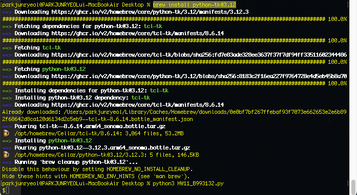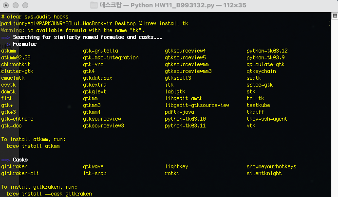 ํ์๋ ์ฒ์์ brew install tk ๋ช ๋ น์ด๋ฅผ ํตํด ์ค์นํ๋ ค๊ณ ํ๋๋ฐ ๋ฒ์ ์ด ๋ง์์ผํ๊ณ ๊ทธ๊ฑด ์์ ์ฌ์ง๊ณผ ๊ฐ์ด ์น์ ํ๊ฒ ์ฌ๋ฌ ํญ๋ชฉ๋ค์ ๋ณด์ฌ์ค๋ค. ๊ทธ๋์ python-tk@3.12 ํ๋ค์์ผ๋ก install ํด์ฃผ์๋ค!!