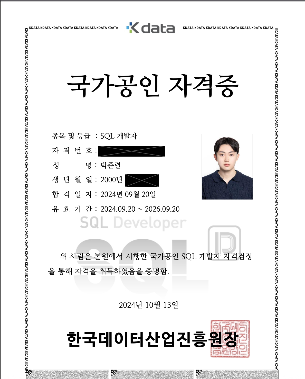 자격증 시리즈의 3번째 글이다. 이번에 소개할 자격은 SQLD라는 자격증으로 말 그대로 관계형 데이터베이스 관리 시스템(RDBMS)의 데이터를 관리하기 위해 설계한 특수 목적의 프로그래밍 언어에 대해 자격을 검증하는 시험이다. (아래는 필자의 자격증 이미지)